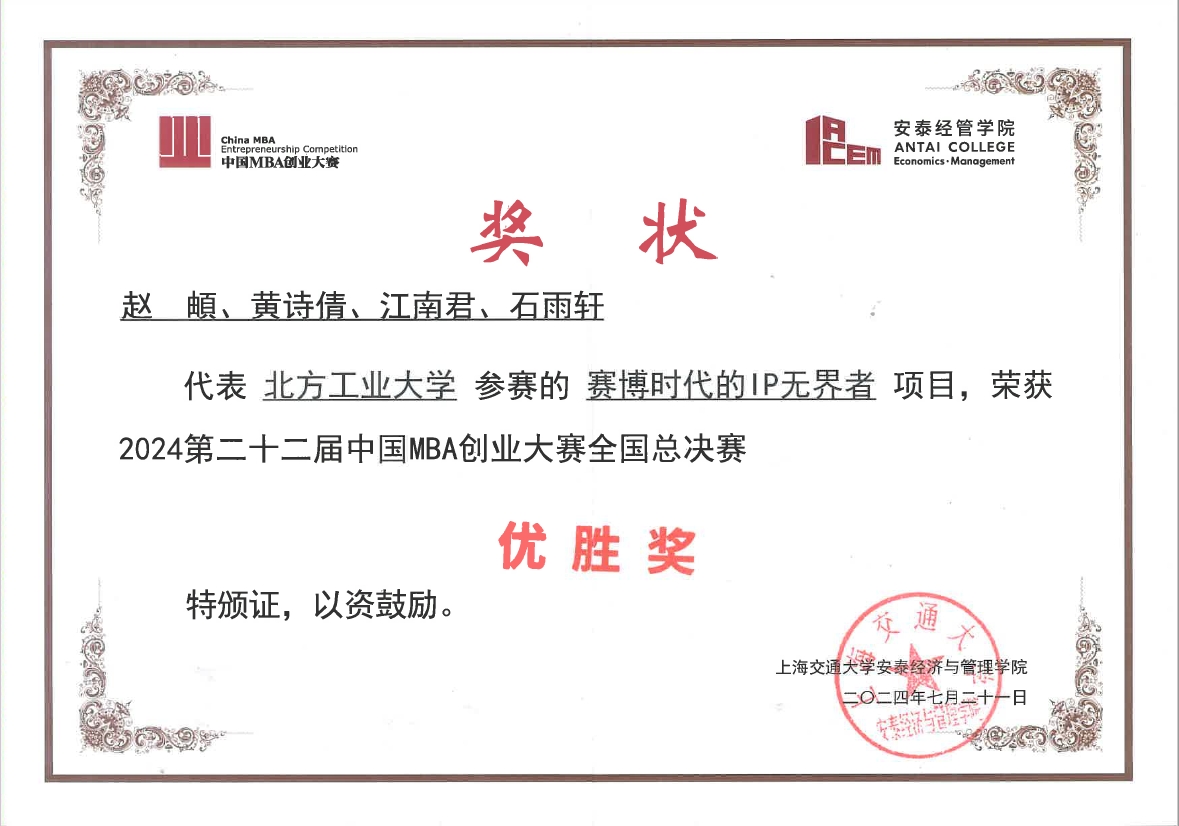 7月21日,第二十二届中国MBA创业大赛全国总决赛在上海交通大学圆满落幕。经过激烈的角逐,点点官网23级MBA赵頔同学负责的“赛博时代的IP无界者”项目荣获全国总决赛“优胜奖”,taptap点点官网刘冰老师荣获“优秀创新创业导师奖”,牛天勇老师荣获“优秀组织奖”。这是taptap点点官网MBA首次参赛,即一路披荆斩棘冲出初赛、入围复赛、挺进全国总决赛,取得优异成绩。