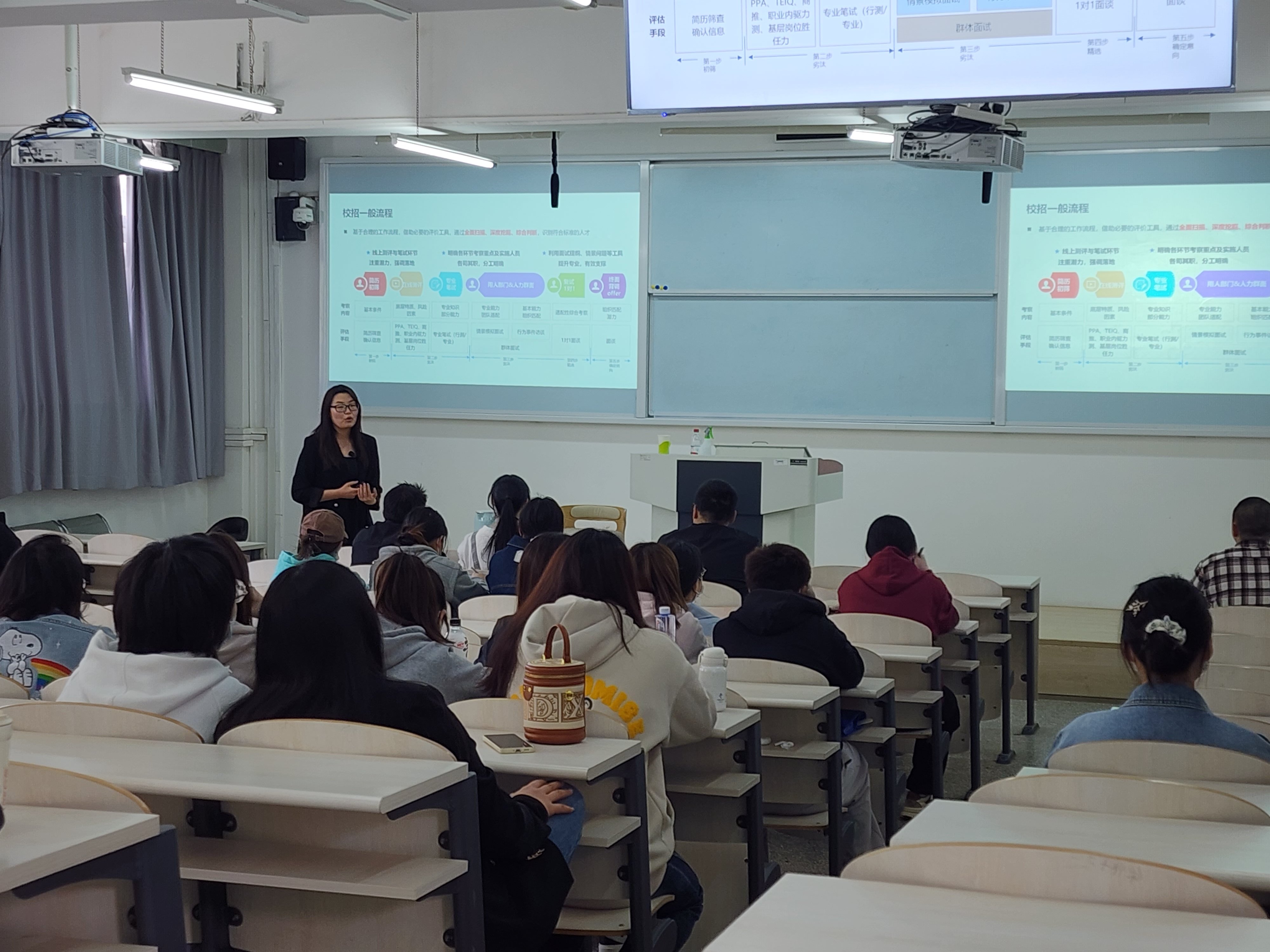随后,雷女士结合自己和身边人求职的真实案例,从三个方面与同学们进行了知识分享:一是校招面试中的一些规则,从招聘方的视角,为同学们讲解了在求职面试时简历、形象、沟通、礼仪等方面应该注意并改进的地方;二是如何选择自己的择业起点,结合大量案例帮助同学们去整理思路,规划自己的职业生涯发展路径;三是结合自己和身边朋友、同事的案例,讲解了面试中不同内容考察的重点,以及初入职场如何让人喜欢。整场讲座,内容一气呵成,帮助与会毕业生拨云见日,厘清求职面试中的重心。