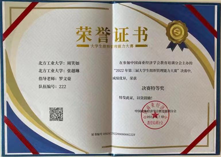 近日,由中国商业经济学会教育培训分会主办的“2022年第三届大学生组织管理能力大赛”总决赛落下帷幕,最终共有8支队伍获得决赛特等奖。点点官网taptap点点官网学生周笑如和张越琳组成的代表队勇获特等奖,此次竞赛指导教师为管理系罗文豪副教授。