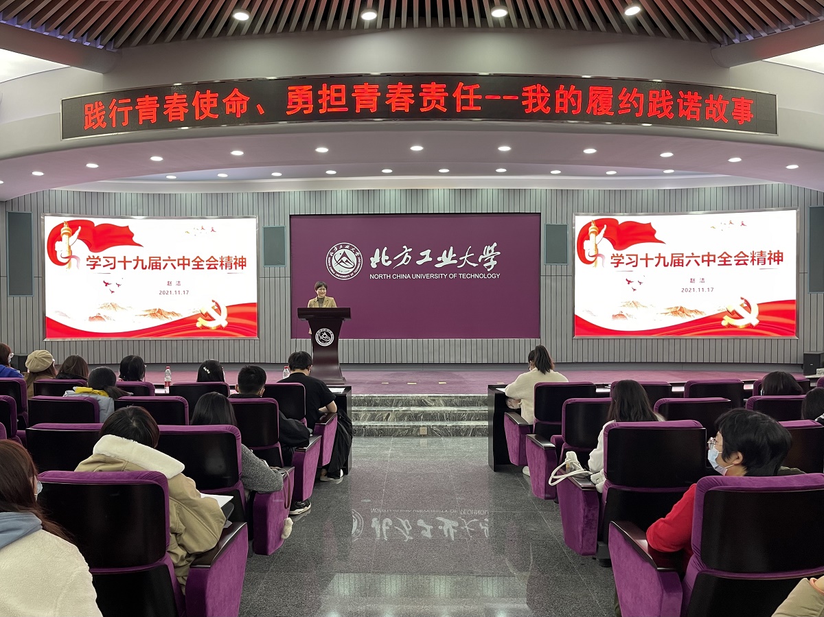 展示之后,赵洁老师点评了同学们的展示情况和各支部同学们的履约践诺完成情况,带领大家集中学习了党的十九届六中全会精神。她指出,党的十九届六中全会的召开,是我党历史上又一次具有里程碑意义的重要会议,会议总结了党的百年奋斗重大成就和历史经验,明确了开启新征程的道路和方式。她强调,各党支部支委要根据学校和学院党委的要求,带领支部同学提高思想认识、认真领会精神,通过学习提升理论水平,通过学习坚定政治信仰。她希望同学们,从党的伟大历史经验中汲取力量,将所学用于日常工作中,发挥引领带动作用,带动身边同学、服务身边同学,让个人价值在奋斗中彰显。