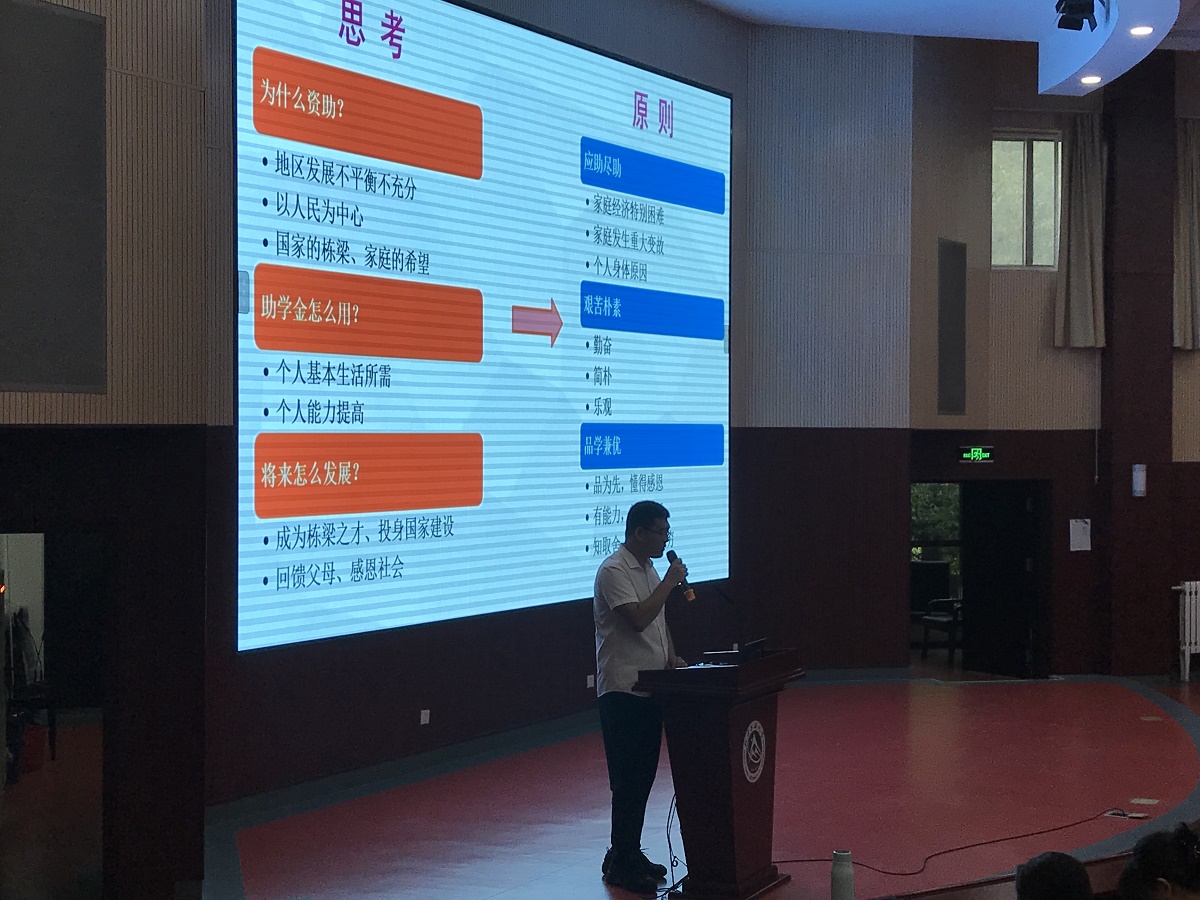 会上,张老师以“为什么资助?助学金怎么用?将来怎么发展?”三个问题展开培训,引导同学们认识到国家的资助政策一方面是缓解家庭经济困难学生经济压力,帮助其顺利完成学业,同时也是为同学们创造与祖国和时代共同成长进步的机会,未来能够帮助家庭,回馈社会。