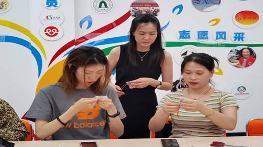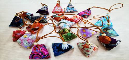 活动中,大家一边缝针,一边讨论如何更好更快地缝制香囊。从最开始的穿针引线,到一针一线将香囊缝合,并学会做双抽线将香囊收紧,有的成员是第一次拿针,针脚虽然歪歪扭扭,却也做得像模像样;有的成员相当心灵手巧,制作了不同形状的香囊。在制作过程中,大家都学得很认真,不一会儿,一块块布、一颗颗小珠子就变成了一个个形状优美、色彩斑斓的香包。