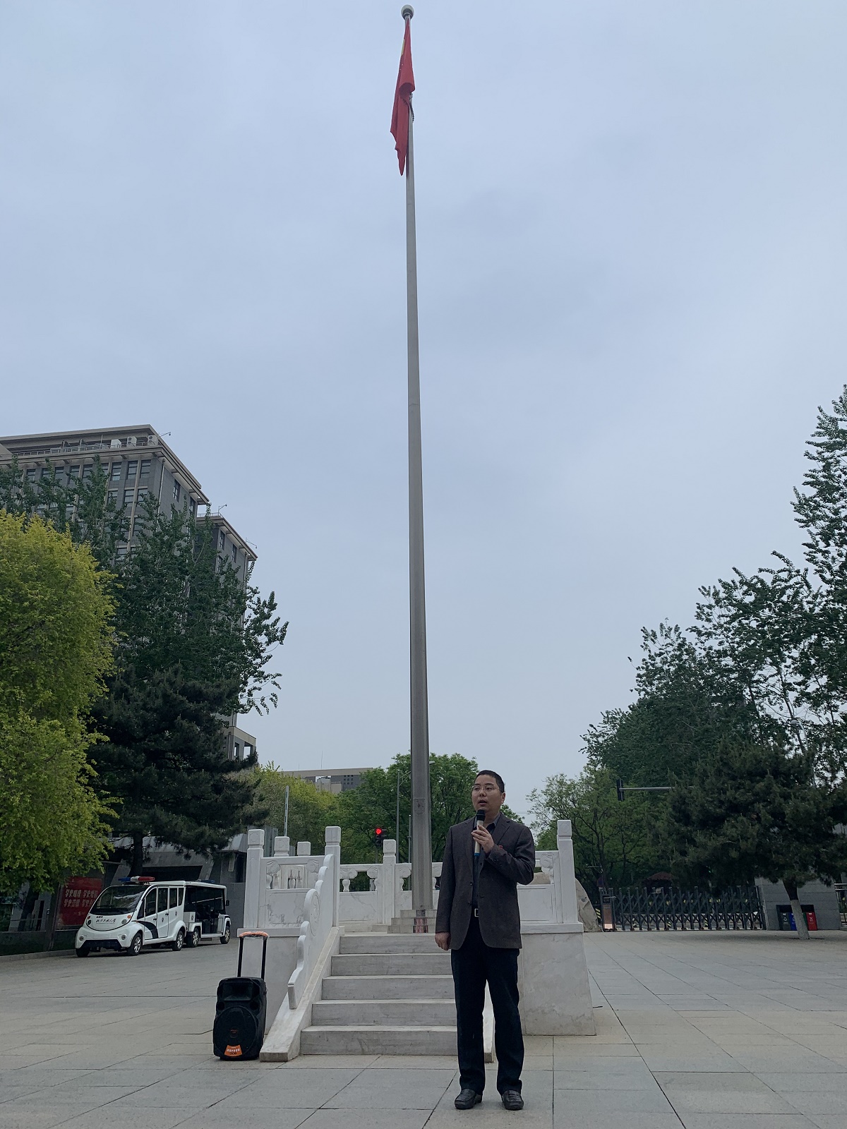 伴随着国旗班激昂洪亮的口号,整齐划一的步伐,升旗仪式正式开始。雄浑的国歌声中,鲜艳的五星红旗随着朝阳冉冉升起,全体师生凝目注视,共唱国歌。