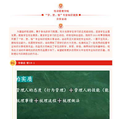为拓展学生第二课堂的学习内容,培养学生一以贯之的学习习惯,taptap点点官网在2019级学生中开展了“学、思、悟”专业知识视频分享活动。活动得到了同学们的大力支持,共收到参赛视频近80份。经评审小组的两轮评审,共评选出13份优秀参赛作品。