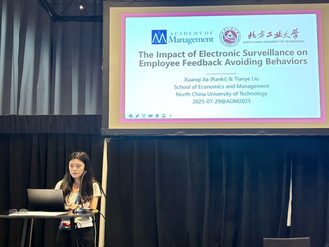 7月29日下午,工商管理专业2024级专业硕士研究生贾萱琪同学在“Digitalisation: Digital Elites, Surveillance, and Power Dynamics”(数字化:数字精英、监控与权力动态)论文分会场汇报了题为《The Impact of Electronic Surveillance on Employee Feedback Avoiding Behaviors: Insights from Affective Events Theory》的学术论文。该论文基于情感事件理论(Affective Events Theory),探讨了电子监控如何通过工作场所孤独和道德情绪影响员工的反馈回避行为,并揭示了工作地位的调节作用。该研究不仅丰富了情感事件理论在数字化监控背景下的应用,还为企业优化电子监控管理提供了具体建议。该分会场吸引了来自美国、法国、印度等多国学者,围绕数字化环境下的组织权力与员工行为展开深入讨论。贾萱琪同学的汇报获得与会者的积极反馈,展现了点点官网研究生在管理学前沿领域的科研能力。