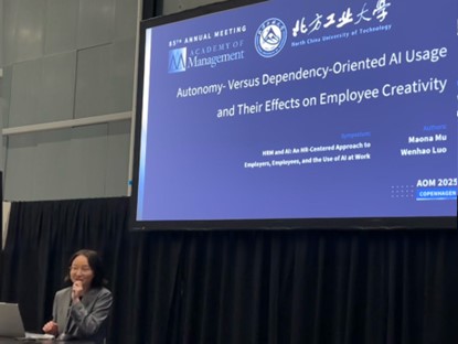 7月29日上午,企业管理专业22级硕士研究生母茂娜于由南洋理工大学的Kang Yang Trevor Yu教授组织的“HRM and AI: An HR-Centered Approach to Employers, Employees, and the Use of AI at Work”(人力资源管理与人工智能)讨论会上,汇报了题为《Autonomy- Versus Dependency-Oriented AI Usage and Their Effects on Employee Creativity》的研究提案。该提案创新性地提出了职场中不同的AI使用方式,并初步为不同使用方式对员工创造力的差异化影响提供了实证支持。来自世界各地的大量学者对该讨论会表现出高度兴趣,部分学者还在会后同汇报者取得联系,计划基于该提案开展后续跨文化合作。