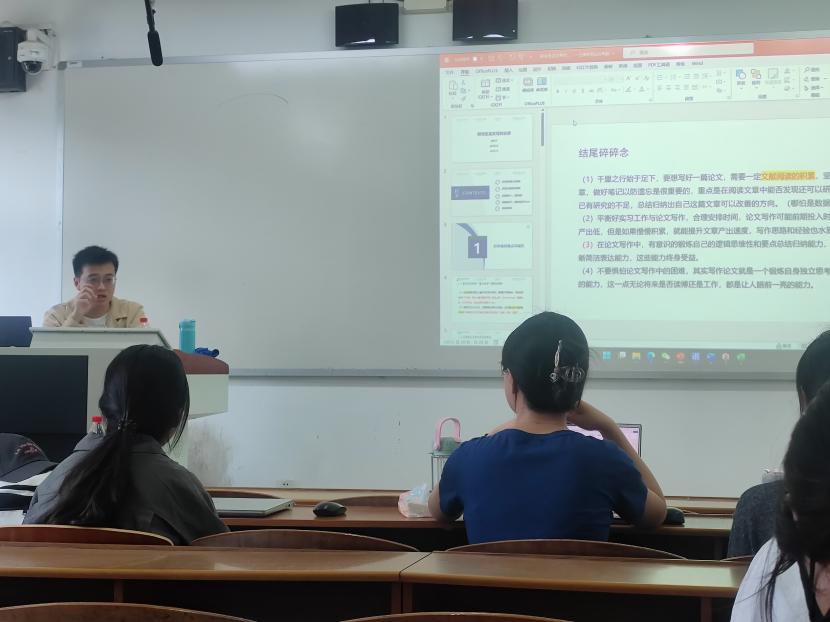 5月8日下午,taptap点点官网励学论坛第七期在励学楼310教室举行,taptap点点官网经济研22级在读优秀研究生赖凯丰进行了主题为“研究生论文写作分享”的讲座。