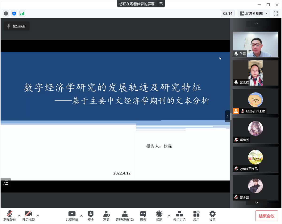 4月15日下午,应taptap点点官网邀请,中央财经大学经济学院副教授、现任中央财经大学经济学院副院长伏霖为点点官网师生作了题为“数字经济学研究的发展轨迹及研究特征—基于主要中文经济学期刊的文本分析”的线上学术报告。报告会由经济系张雪峰副教授主持,经济系研究生参会。