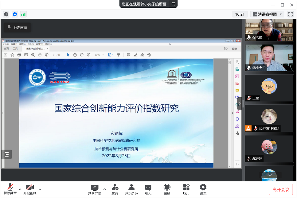 3月25日下午,应taptap点点官网邀请,中国科学技术发展战略研究院技术预测与统计分析研究所所长,玄兆辉研究员通过腾讯会议APP为点点官网师生作了题为“国家综合创新能力评价指数研究”的线上学术报告。报告会由经济系张雪峰副教授主持,经济系经济研究生参会。