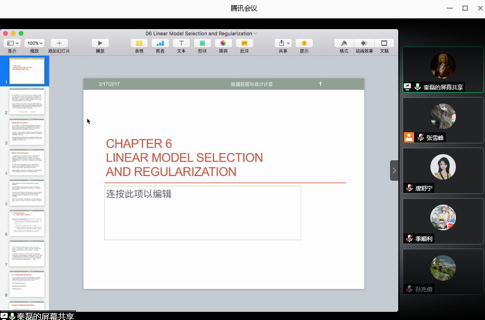 本报告主要从最优子集选择、收缩算法、降维方法三个方面介绍了线性模型的选择问题和线性模型规则化方法,最优子集选择中介绍了准则判断方法、向前选择、向后选择方法,收缩算法中介绍岭回归、Lasso方法,降维方法中介绍主成分分析方法、偏最小二乘法;最后,秦磊副教授还就师生提出的问题进行了交流讨论。