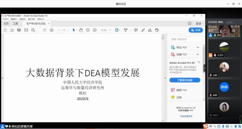 6月12日下午,应经济研究所邀请,中国人民大学经济学院韩松教授通过腾讯会议平台为我院师生作了题为“大数据背景下DEA模型发展”的学术报告。报告会由经济系王书平教授主持。