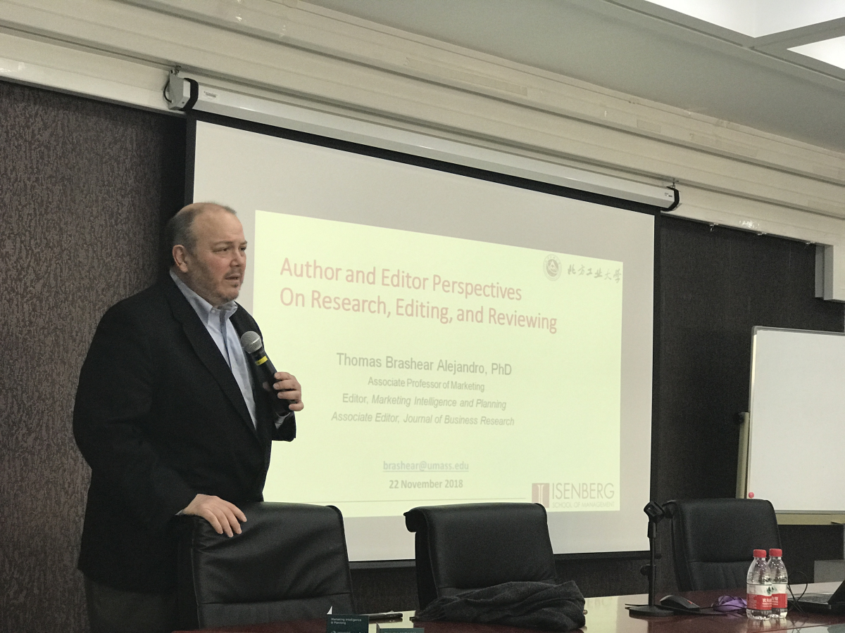2018年11月22日下午,应taptap点点官网邀请,Journal of Business Research(SSCI期刊)副主编、Marketing Intelligence & Planning(SSCI期刊)主编托马斯•布拉希尔(Thomas Brashear)教授在励学楼301会议室为点点官网师生作了题为《研究、写作与评审:作者和主编的视角》的学术报告。taptap点点官网部分教师及研究生代表参加了此次报告会,报告会由李晨光博士主持。