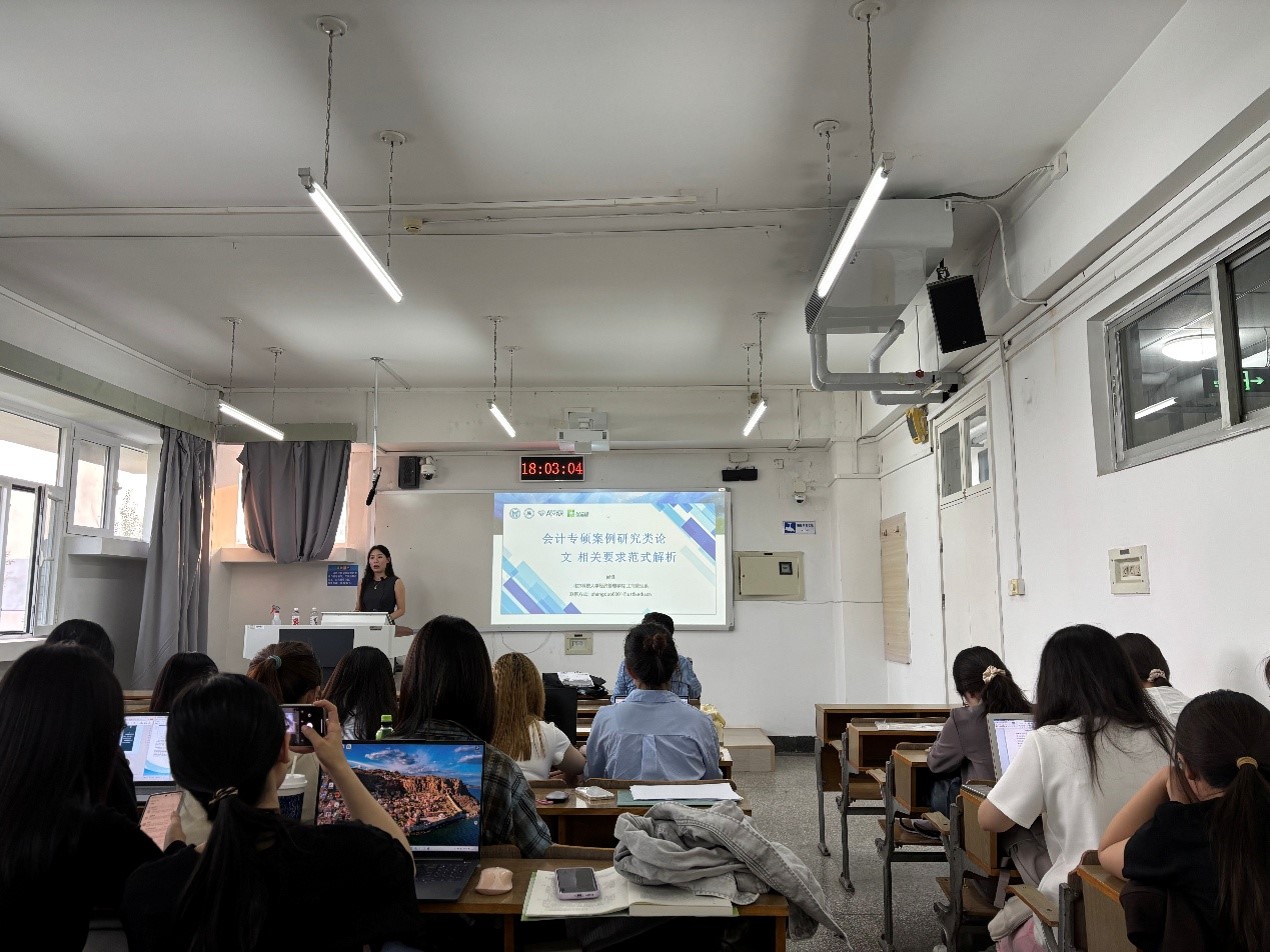 讲座紧扣会计专硕研究生案例研究类论文写作展开。尚老师指出,选好题是写好论文的关键,并依照教指委对案例研究类论文的评价参考要素,详细解读了选题要点,强调会计专硕学位论文要源于有价值的企业管理问题或实践,还给出具体实用的建议,回答了同学们选题面临的困惑和疑问。在案例陈述环节,尚老师先明确案例论文基本定位,介绍了问题型、描述型等案例研究论文类型,并结合具体撰写范例,让同学们直观理解如何精准、清晰地进行案例陈述。随后,尚老师分享了从 AMJ 论文中梳理的涵盖12个微观和8个宏观经典管理理论,指导同学们根据具体选题选择适宜的经典管理学理论深入剖析案例,完成论文写作。