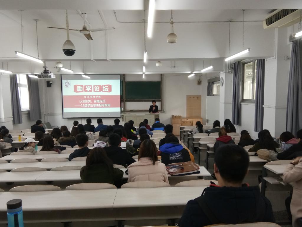 2018年3月19日和3月21日,taptap点点官网在励学楼324教室分专业召开了励学论坛,主题为“认清形势、合理定位——面向15级考研学子谈报考”。学院党委副书记赵洁、15级辅导员马骆茹和15级全体考研学生一同参加了此次论坛。