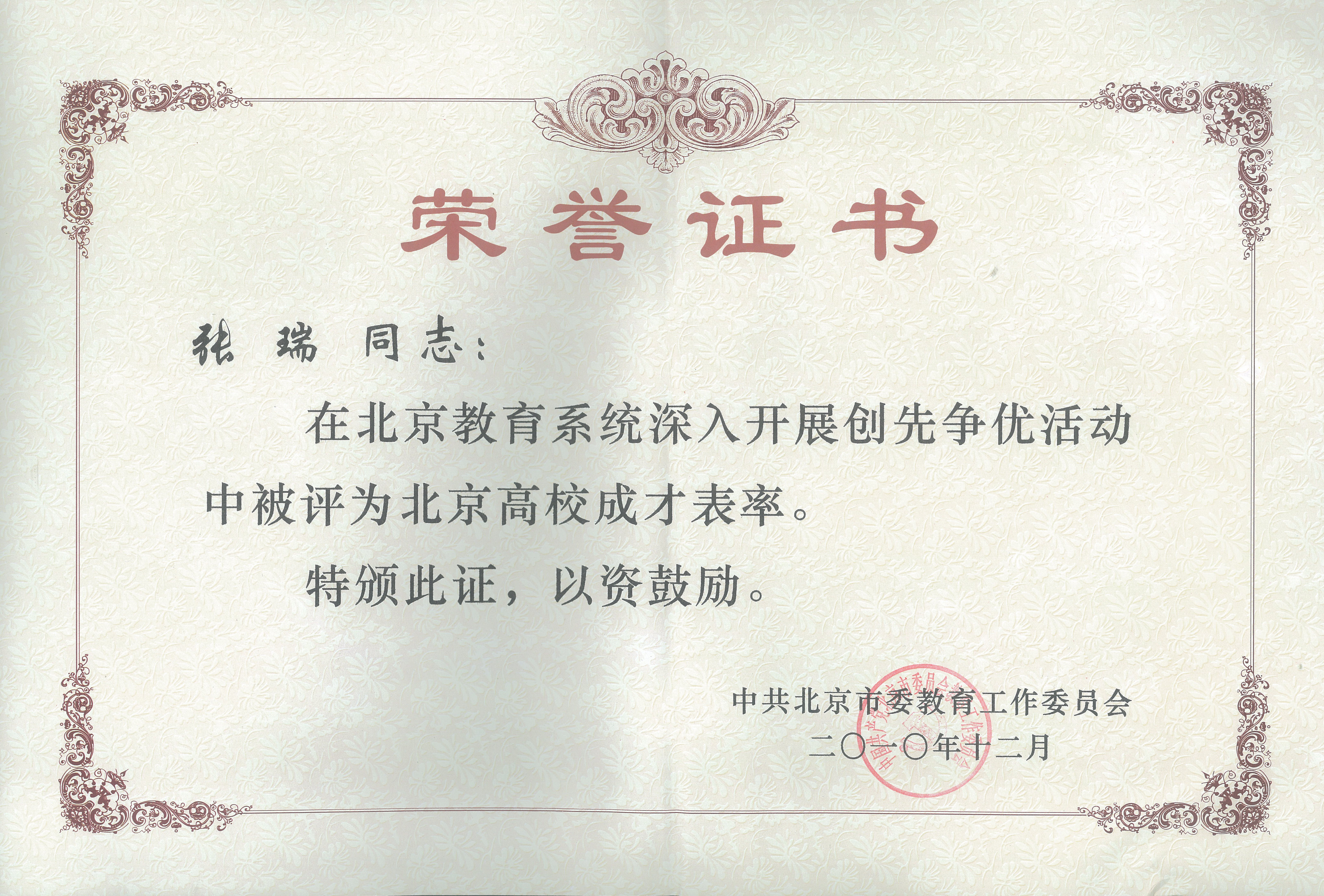 张瑞同学学习刻苦,成绩优异,曾获全国大学生英语竞赛特等奖1次、一等奖2次、国家奖学金1次,校级一等奖学金多次、全国大学生英语演讲比赛优秀奖1次。始终把集体利益放在首位,助人为乐、无私奉献。积极带头参加科学研究和社会实践,表现出强烈的社会责任感。2011年以优异的成绩考取中央财经大学金融学专业研究生。