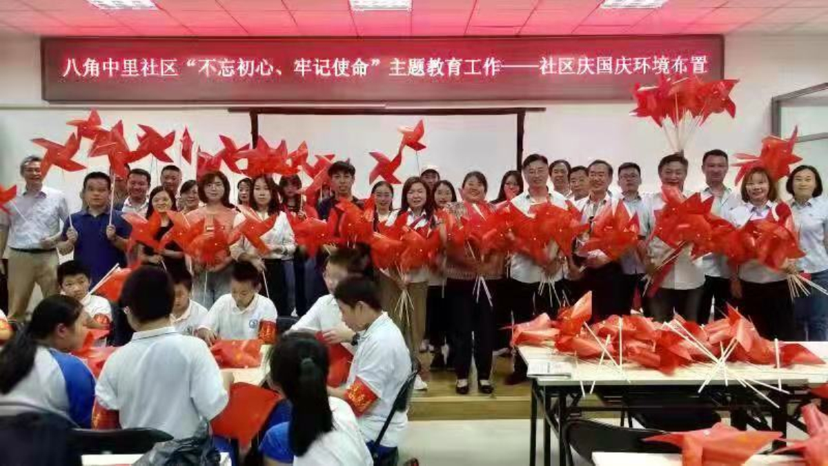 座谈会后,学生党员与社区党员、中小学生和一起动手为社区进行迎国庆环境布置。大家制作了带有国旗图案的风车,并前往社区空地,将风车摆放成“庆70”的字样,安插在草坪当中,为社区里增添了迎国庆的喜悦气氛。
