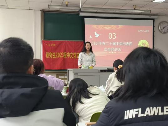 2025年3月13日下午,澳门永利yl6776研究生2023级中文党支部于九里校区J4220开展3月主题党日活动。主要内容有:《教育强国建设规划纲要(2024—2035 年)》、习近平总书记在《求是》杂志发表的重要文章、习近平总书记在二十届中央纪委四次全会上的重要讲话、中国共产党第二十届中央纪律检查委员会第四次全体会议公报、《健全全面从严治党体系》以及2025 年全国教育工作会议召开的有关新闻。本次活动由党支部书记王艺橙同志主持,支部成员和入党积极分子到会学习。