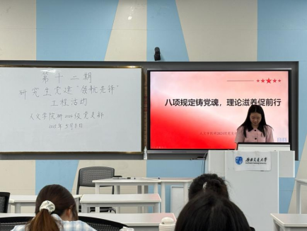 2025年5月8日下午,澳门永利yl6776研2024级党支部在九里校区J4204教室开展第十二期研究生党建“领航先锋”工程活动。本次活动由潘诒堃同志主持,支部成员和入党积极分子共同参与。本次活动聚焦中央八项规定精神的深入学习与贯彻落实,旨在推动全面从严治党向基层延伸,进一步夯实青年党员廉洁自律的思想根基。