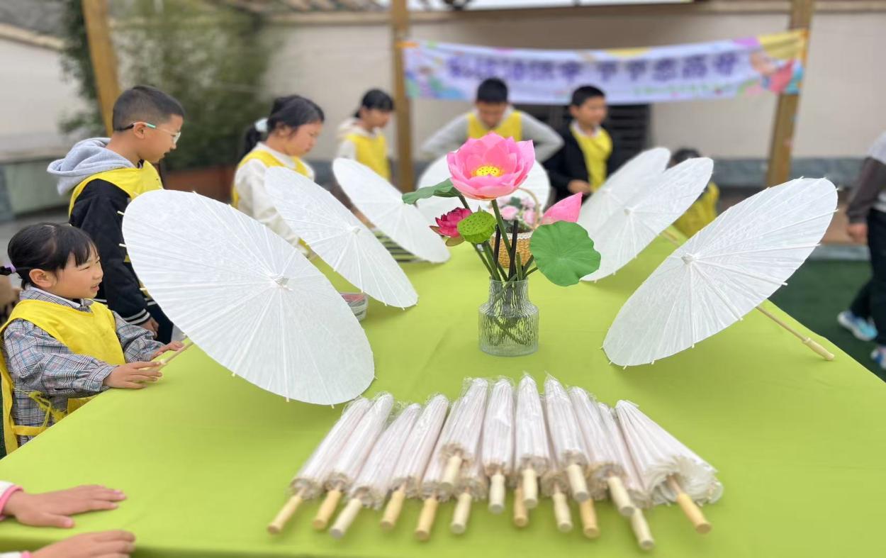 随后,志愿者们带领孩子们亲手制作油纸伞。在志愿者的耐心指导下,孩子们认真绘画,虽然动作略显稚嫩,但每个人都全情投入,现场气氛热烈而温馨。