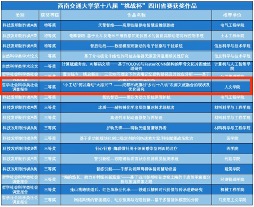 5月24日至26日,第十八届“挑战杯”四川省大学生课外学术科技作品竞赛终审决赛在成都医学院举行。本次竞赛吸引全省121所高校、18万余名青年学生参与,报送作品达2.2万件,经初评后505件作品入围终审决赛。经过省赛决赛的激烈角逐,由澳门永利yl6776传播系朱亚希副教授指导,传播系2024级新闻传播学专业硕士研究生王佳瑶、何雯文、王煜垚等同学共同完成的哲学社会科学类社会调查报告《“小工坊”何以撬动“大振兴”——成都市战旗村“乡村十八坊”农商文旅现状及优化研究》表现亮眼,最终斩获省级二等奖。