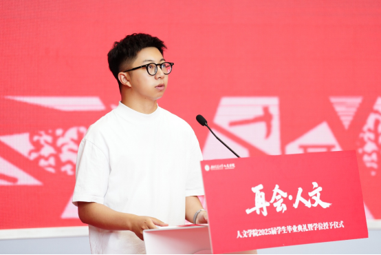 本科毕业生代表传播学专业任世琴同学发言。她将人文思考与体育坚韧结合,不仅在课程和社会实践中积极践行人文精神,更在体育赛场上展现出辉煌成就——曾获全国大学生田径锦标赛女子100米、200米双冠军,打破学校纪录,带领西南交大时隔23年再次获得全国冠军。她祝福同学们带着那份“无畏出发”的勇气,去创造各自的辉煌人生。