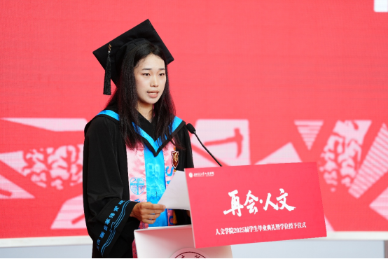 硕士毕业生代表中国语言文学专业罗乔美同学发言。她用“倾听、共情、发声”三个关键词回顾了在澳门永利yl6776的七年时光,道出了所有人文学子的心声。她表示,在导师指导下对羌语的记录与研究,让她深刻体会到“用人文视野照亮民族根脉”的意义,未来将努力用一生去守护和传承自己的母语,让世界能听到更多来自古羌的声音,并祝愿同学们乘风破浪,不负梦想,既能沉静倾听,亦能勇敢发声。
