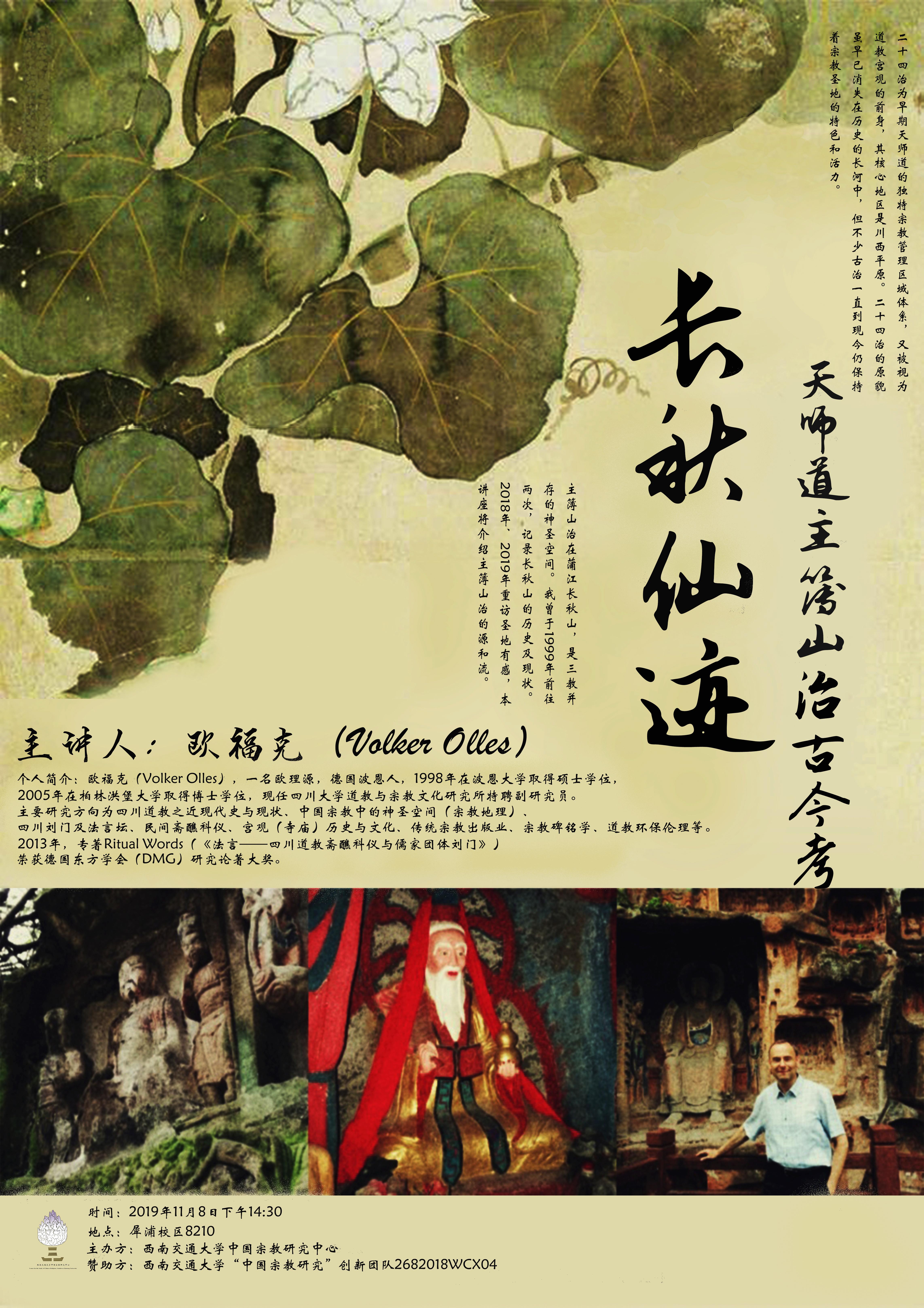 【主讲人简介】欧福克(Volker Olles),一名欧理源,德国波恩人,1998年在波恩大学取得硕士学位,2005年在柏林洪堡大学取得博士学位,现任四川大学道教与宗教文化研究所特聘副研究员。主要研究方向为四川道教之近现代史与现状、中国宗教中的神圣空间(宗教地理)、四川刘门及法言坛、民间斋醮科仪、宫观(寺庙)历史与文化、传统宗教出版业、宗教碑铭学、道教环保伦理等。2013年,专著Ritual Words(《法言——四川道教斋醮科仪与儒家团体刘门》)荣获德国东方学会(DMG)研究论著大奖。